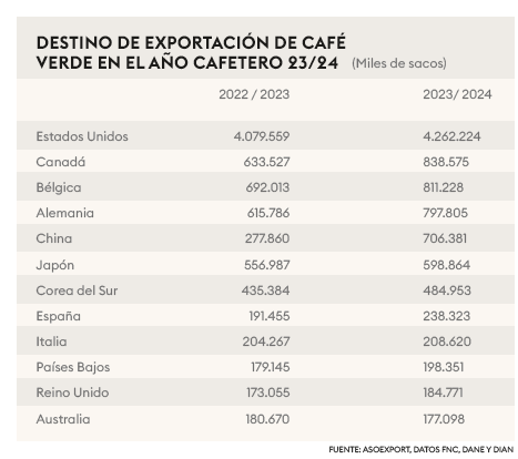 En cuanto a los mercados de exportación, en el año cafetero 23-24 los principales presentaron crecimientos. Estados Unidos tuvo un aumento de 183 mil sacos y alcanzó una participación total