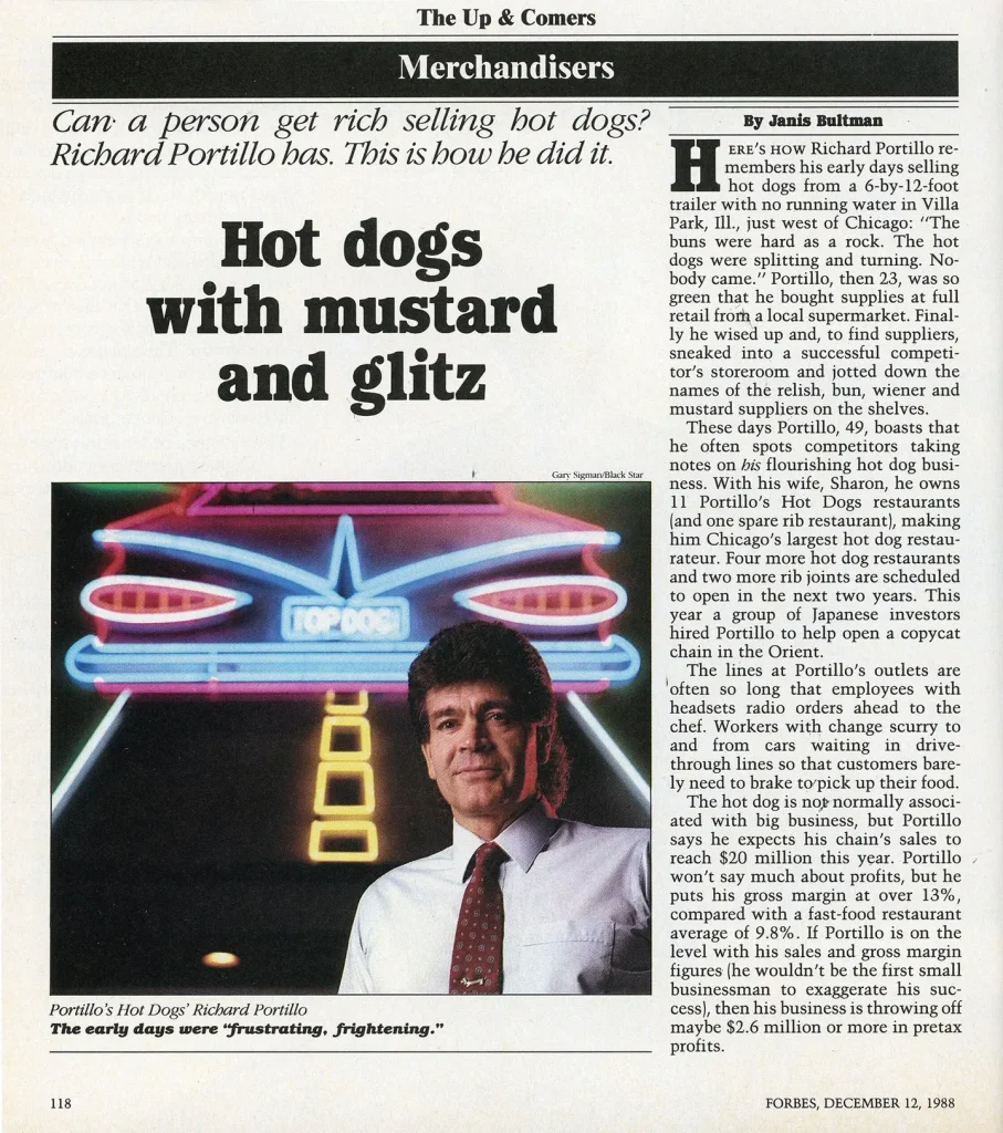 Para 1988, Portillo facturaba 20 millones de dólares anuales en ventas. Ese mismo año, Forbes lo describió como una persona prometedora. El artículo detallaba cómo decoraba cada local de Portillo con antigüedades, dándole a cada uno una temática diferente, desde un comedor de los años 30 hasta un restaurante de los años 50. «Estas son cosas que una empresa de comida rápida promedio no haría», declaró Portillo a Forbes en aquel momento.