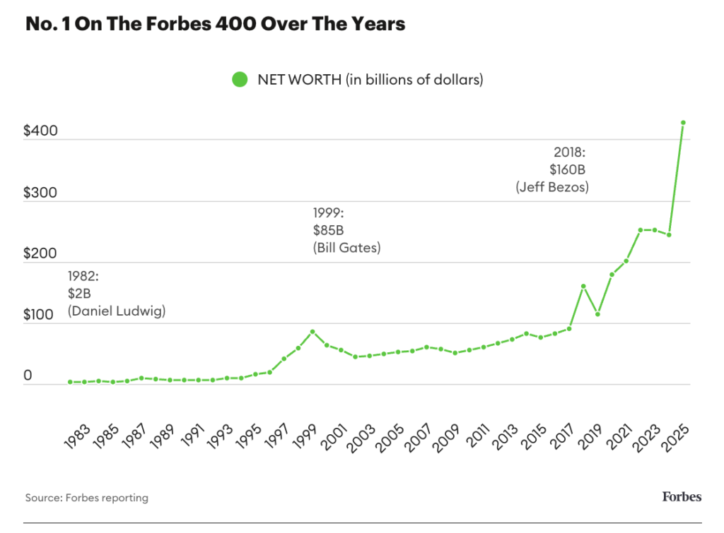 También hay un récord en la parte superior de la lista: Elon Musk es la primera persona en romper la marca de 400 mil millones en The Forbes 400. Es la persona más rica de Estados Unidos por cuarto año consecutivo, con un valor asombroso de 428 mil millones después de agregar 184 mil millones a su fortuna gracias a un aumento en las acciones de Tesla (que han subido un 56%) y 12 meses más de aumento de las valoraciones de su empresa privada de cohetes SpaceX y el equipo de inteligencia artificial xAI. Musk tiene 52 mil millones por delante del segundo lugar, Larry Ellison , una suma mayor que todo el patrimonio neto de Warren Buffett. Aún así, Ellison (ahora con un valor de 276 mil millones) es 101 mil millones más rico este año gracias a un aumento del 60% en el valor de las acciones de Oracle. Ocupa el segundo lugar por primera vez en 25 años. Mark Zuckerberg , por su parte, es la tercera persona más rica de Estados Unidos, con una fortuna de 253,000 millones de dólares tras un aumento del 42 % en las acciones de Meta, la empresa matriz de Facebook. Forbes calculó el patrimonio neto utilizando los precios de las acciones al 1 de septiembre de 2025.