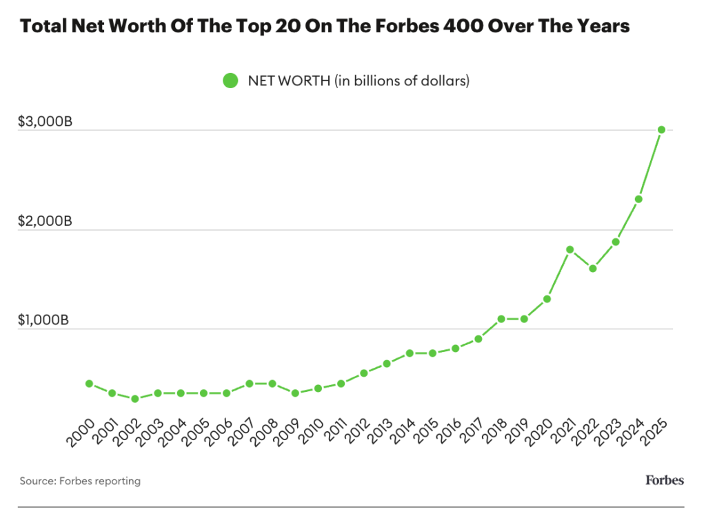 Un año más, otra serie de récords superados para los 400 estadounidenses más ricos . Su patrimonio total es una cifra récord de 6,6 billones de dólares , tras aumentar en 1,2 billones de dólares en los últimos 12 meses. Ahora se necesita un récord de 3.800 millones de dólares para entrar en la clasificación, 500 millones de dólares más que el mínimo en 2024.