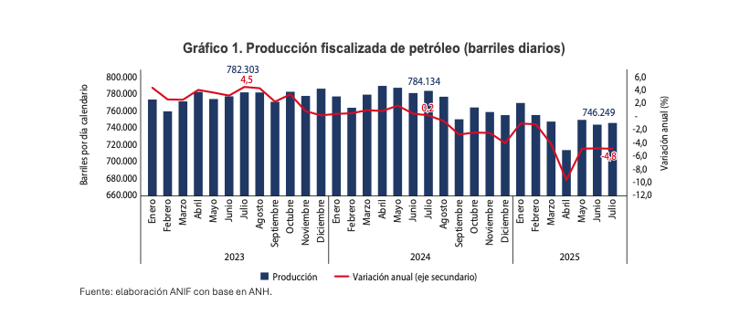 El sector petrolero colombiano enfrenta su etapa más crítica en años recientes. Según un análisis de la Asociación Nacional de Instituciones Financieras (Anif), entre enero y julio de 2025 la producción promedio fue de 746.826 barriles diarios, 4,3 % menos que en 2024. Abril marcó el punto más bajo, con 714.229 barriles por día, una contracción de 9,6 % frente al mismo mes del año anterior y el nivel más reducido desde junio de 2021.