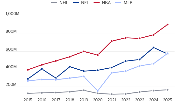 Los diez jugadores mejor pagados de la NBA están a punto de recaudar 902 millones de dólares esta temporada, un 131% más que las proyecciones de Forbes de hace una década, un crecimiento más rápido que el registrado por la MLB, la NFL y la NHL.