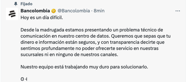 Luz María Velásquez, vicepresidenta de Personas, Pymes y Empresas de Bancolombia afirmó que “en ningún momento hemos tenido una vulneración de nuestros sistemas, la información y la plata han estado y están 100% seguras”. También garantizó que desde Bancolombia y su equipo técnologico siguen trabajando para restablecer sus servicios.