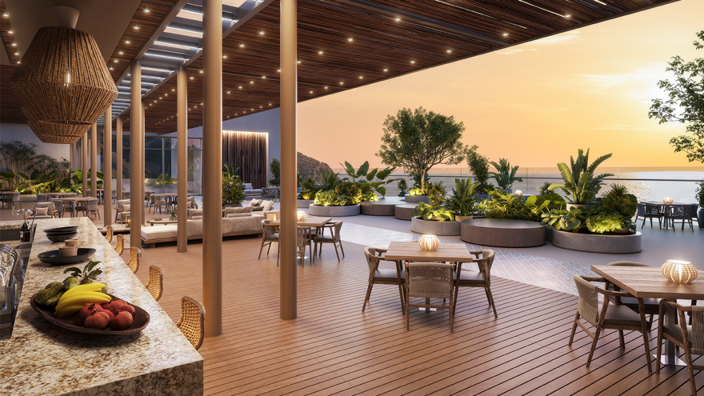 El diseño arquitectónico también aporta al bienestar ambiental. Los balcones amplios y las fachadas claras crean un efecto de sombra natural que puede disminuir hasta cinco grados la temperatura interior, favoreciendo la iluminación y ventilación natural. Finalmente, el paisajismo con especies nativas no es solo estética, conserva la biodiversidad, requiere menos mantenimiento y protege el equilibrio ecológico del entorno costero.