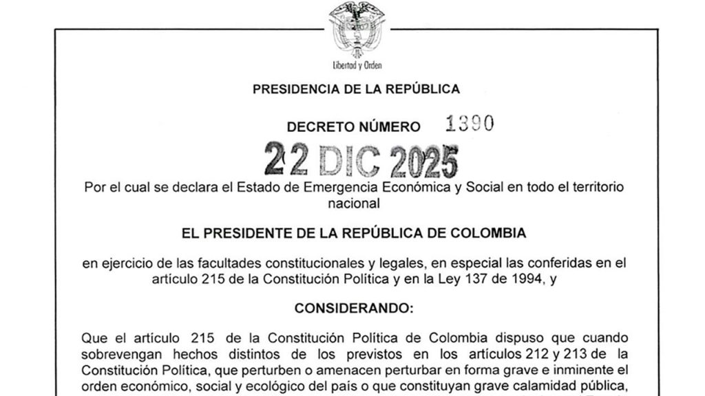 En el decreto 1390 de 2025, el Gobierno del presidente Gustavo Petro declaró “el estado de emergencia económica en todo el territorio nacional por el término de 30 días calendario, contados a partir de la vigencia” de ese documento.