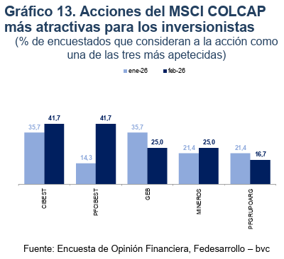 En febrero, las acciones preferidas fueron la acción ordinaria y preferencial de Cibest al ser seleccionadas cada una por el 41,7% de los analistas. En segundo lugar, se ubicaron la acción ordinaria del Grupo de Energía de Bogotá (GEB) y la acción ordinaria de Mineros que fueron seleccionadas por el 25% de los analistas. Finalmente, en tercer lugar, se ubicó la acción preferencial de Grupo Argos al ser seleccionada por el 16,7% de los analistas.