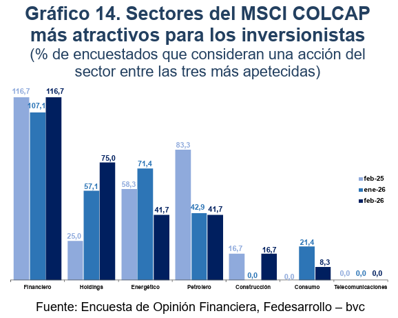 La encuesta también reveló que este mes se observó un incremento en el apetito por las acciones del sector financiero, holdings y construcción respecto al mes anterior, y una disminución en el apetito por las acciones del sector energético, petrolero y de consumo.