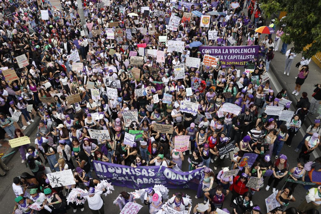 Centenares de colombianas salieron este domingo a las calles de Bogotá con consignas de rechazo a la violencia contra las mujeres y en memoria de las víctimas de feminicidios, en la movilización por el Día Internacional de la Mujer, que se conmemora el 8 de marzo pero este año se aplazó una semana por las elecciones legislativas del país.