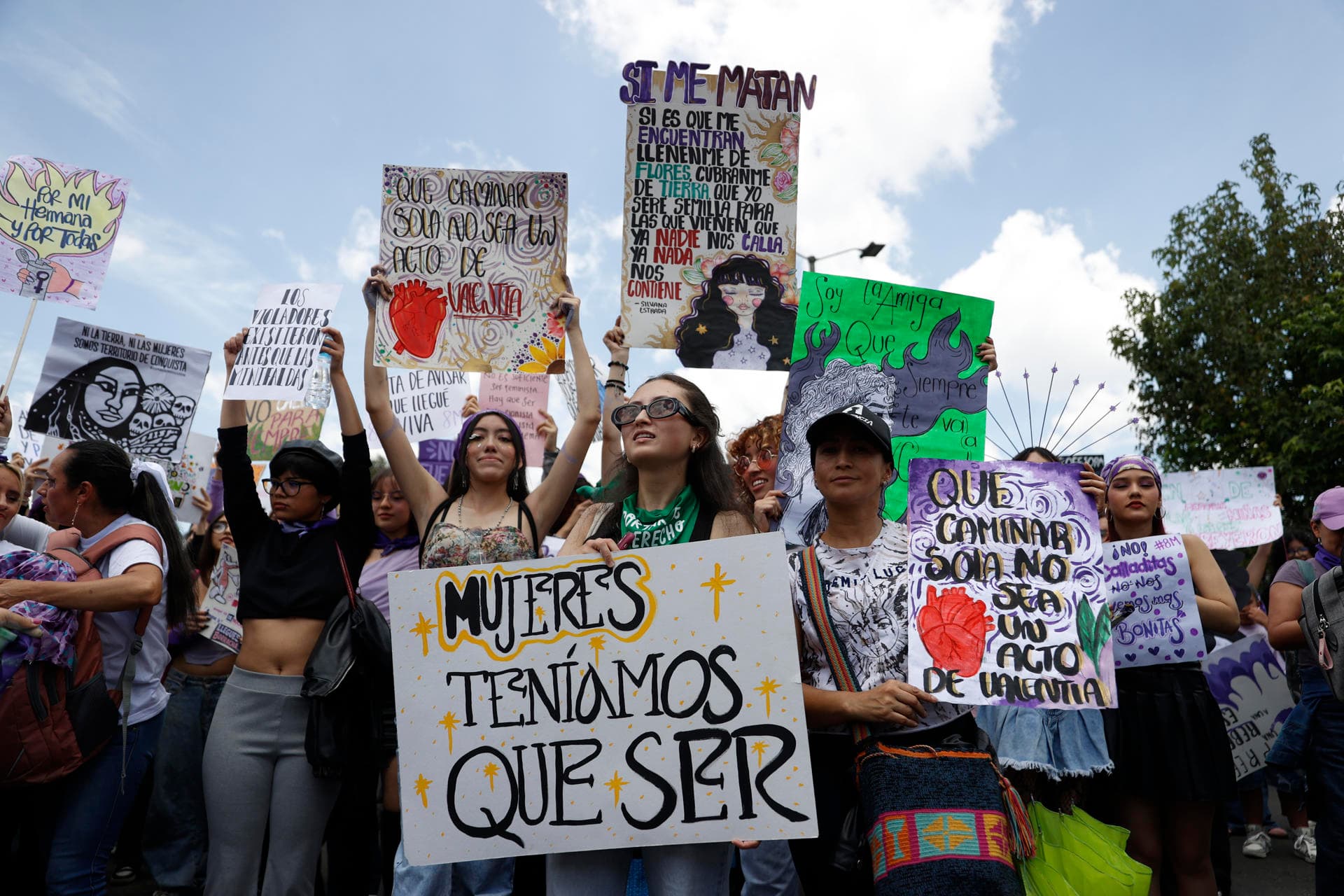 Vestidas con pañuelos y prendas moradas y verdes, las manifestantes avanzaron entre cánticos, pancartas y mensajes de resistencia. En carteles que se alzaban entre la multitud se podían leer frases como “Somos el corazón de las que ya no laten”, “Hay que abortar este sistema patriarcal” o “Nos quisieron quemar y nos volvimos fuego”.