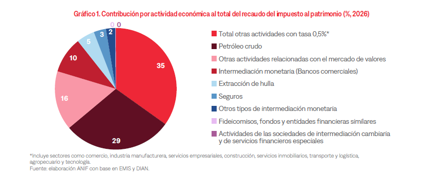 ANIF estima que el recaudo potencial del impuesto ascendería a $6,3 billones. De ese total, $4,1 billones (65%) provendrían de los sectores sujetos a la tarifa más alta del 1,6%, mientras que los $2,2 billones restantes (35%) corresponderían a las actividades gravadas con la tarifa general del 0,5%.
