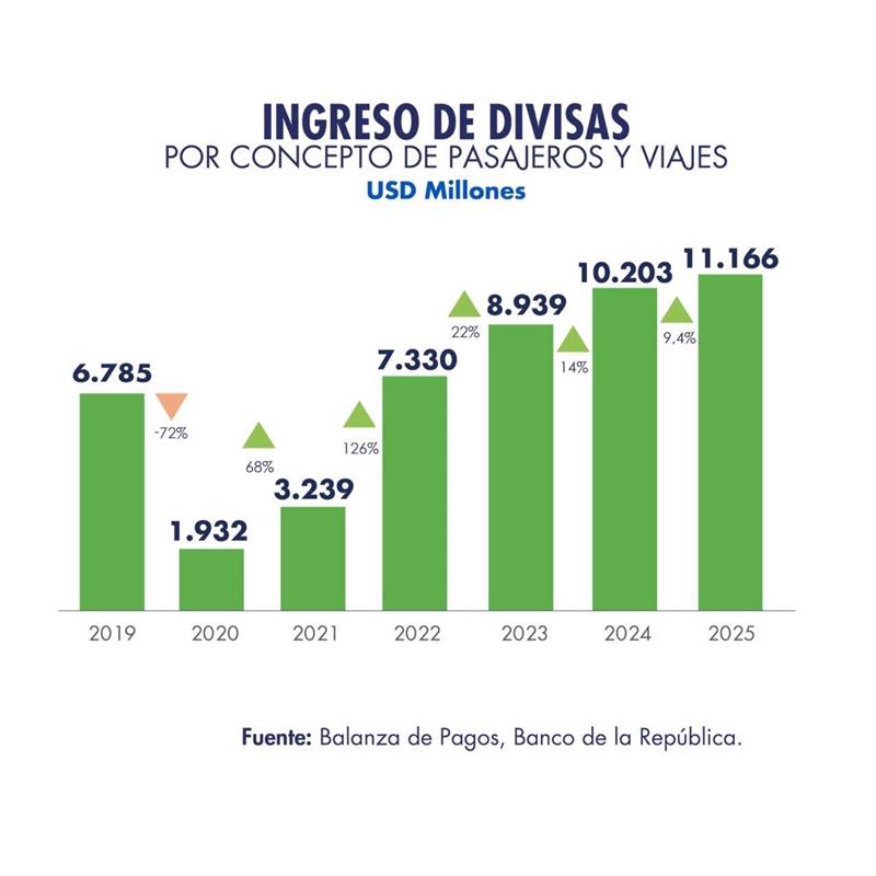 Procolombia presentó el balance de lo que fue el 2025 para el país en materia de turismo. Durante el año pasado Colombia tuvo ingresos por 11.166 millones de dólares por concepto de transporte aéreo de pasajeros y viajes.