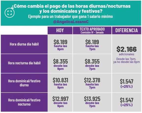 Con la nueva reforma, el recargo nocturno en días hábiles se pagará desde las 7 p. m. hasta las 6 a. m. del día siguiente y tendrá un valor de $8.355 por hora. Antes de la reforma, este recargo iniciaba a las 9 p. m. y tenía un valor de $6.189, por lo que ahora los trabajadores reciben dos horas adicionales de pago con recargo nocturno.