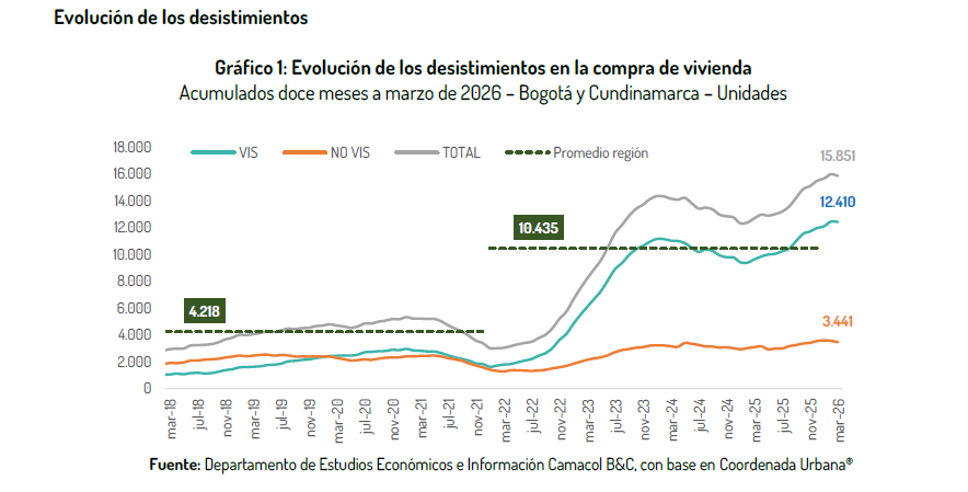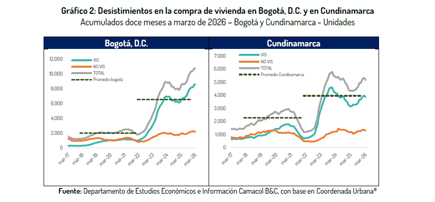 Según Camacol Bogotá y Cundinamarca, entre enero y marzo de 2026 se registraron 3.679 desistimientos en la región, lo que representa un incremento de 11,5% frente al mismo periodo del año anterior.