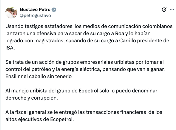El presidente Gustavo Petro ha respaldado públicamente a Roa, quien fue el gerente de su campaña, y ha atribuido los cuestionamientos a intereses políticos y empresariales. “Se trata de una acción de grupos empresariales uribistas para tomar el control del petróleo y la energía eléctrica, pensando que van a ganar. Ensillan caballo sin tenerlo”, señaló Petro en la red social X.
