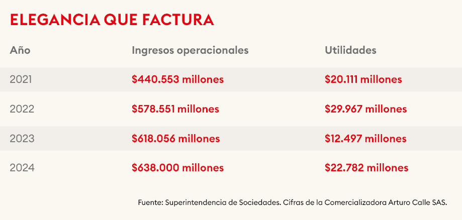 En 2024, Arturo Calle había registrado ingresos de $638.380 millones con utilidades de $22.782 millones, compitiendo con muchos, incluyendo a gigantes del sector como Koaj y H&M.